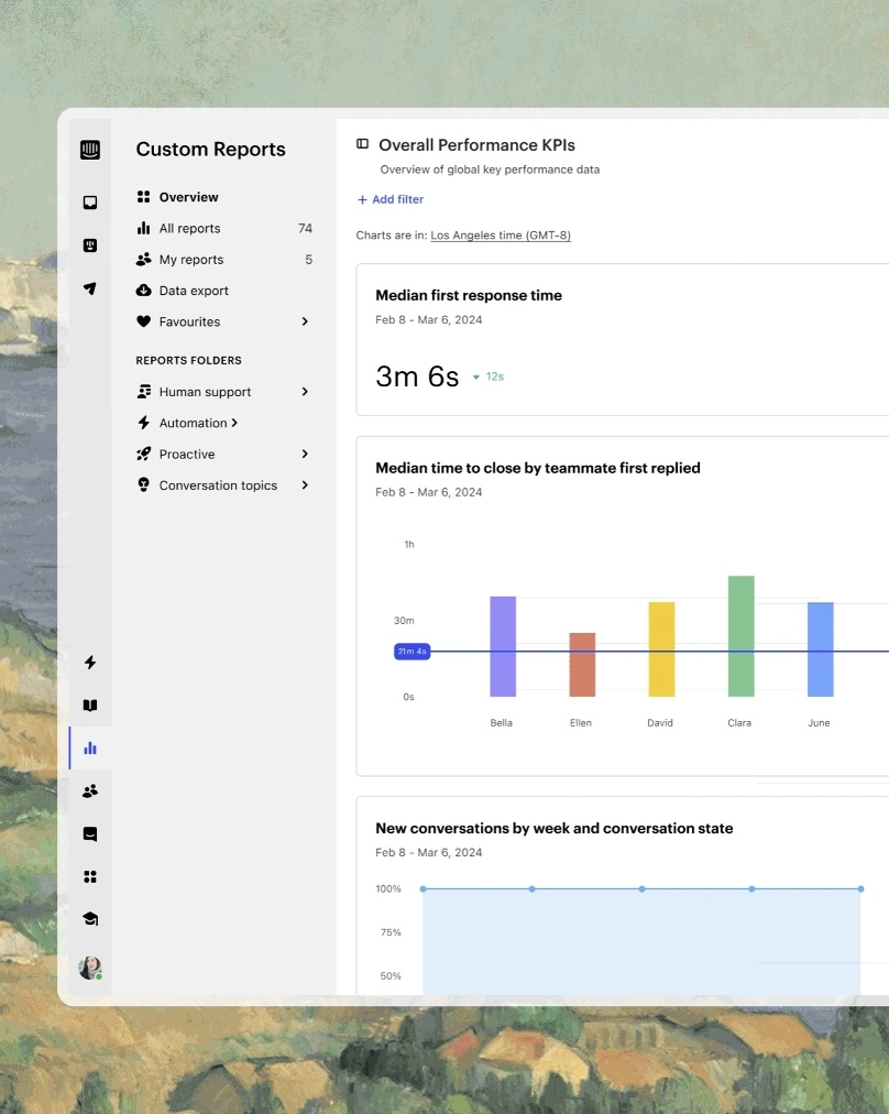 Intercom’s AI-powered reporting gives you the tools to monitor, analyze, and optimize your support operations in real time. With instant AI insights, customizable reports, and actionable customer feedback, you can make data-driven decisions to boost your team performance.