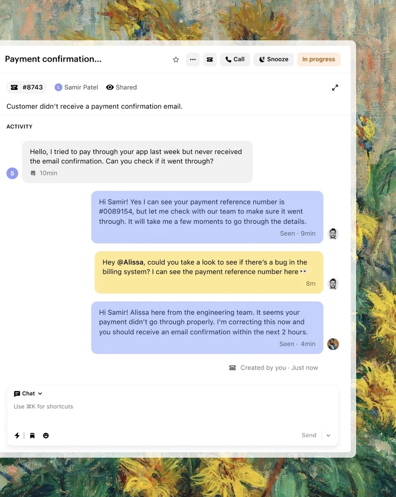 Move seamlessly from conversations to tickets to keep customers informed while solving issues. With back-office collaboration and shared tracker tickets, your team can coordinate effortlessly and manage multiple customer updates with ease.