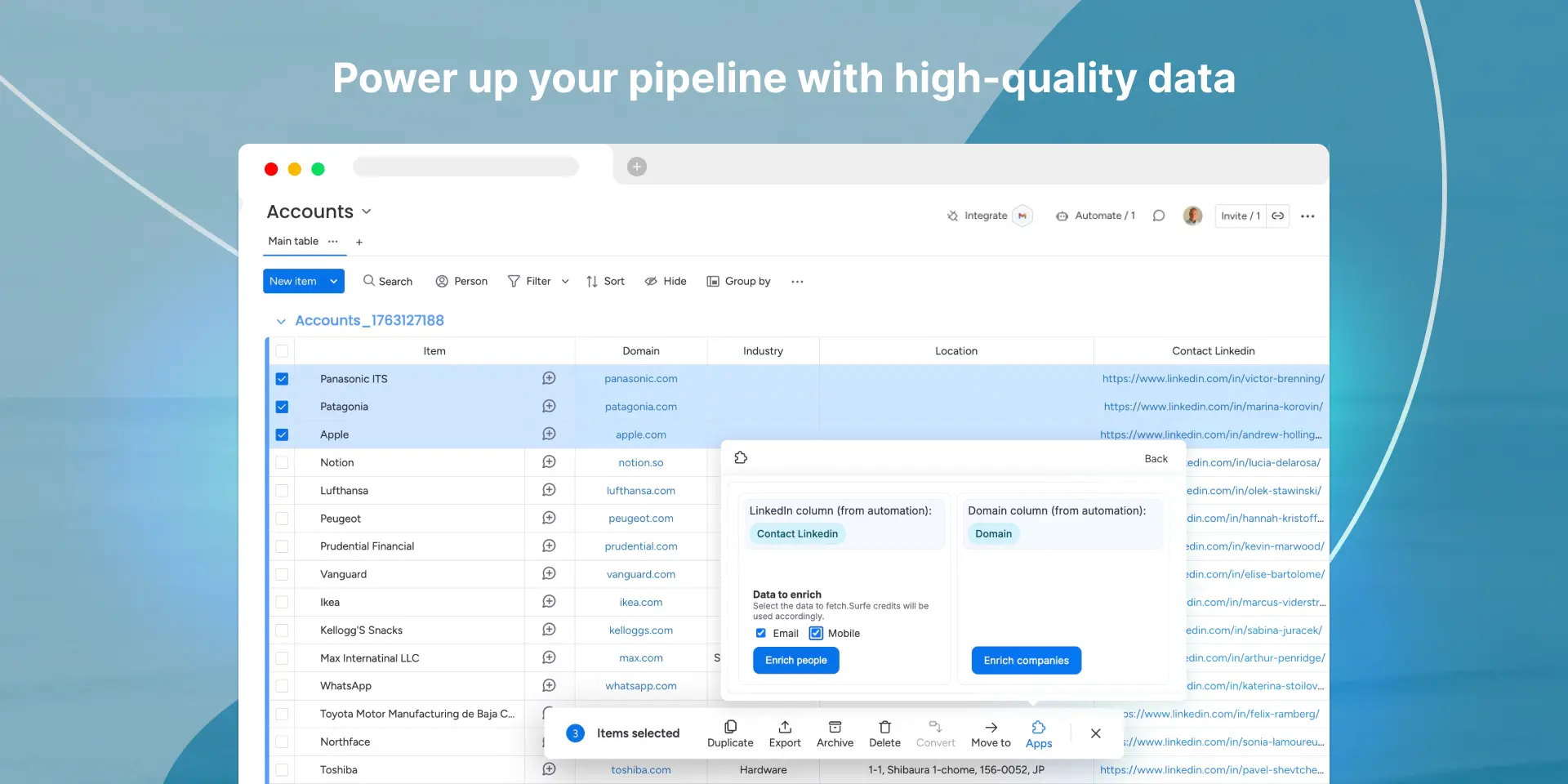 Custom Field Mapping: Have full control over where data lands. Map Surfe data points (like revenue, employee count, or job title) to your exact monday.com board columns.