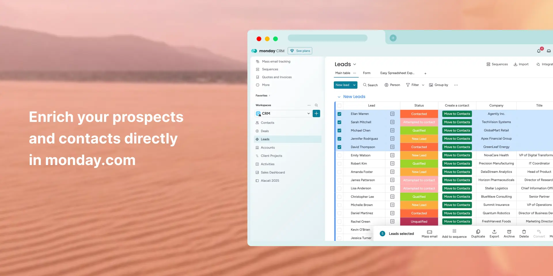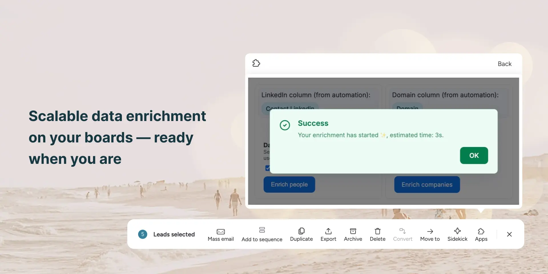 SDRs and sales teams can prepare outreach lists and enrich inbound leads instantly before qualification, right where they manage their pipeline.